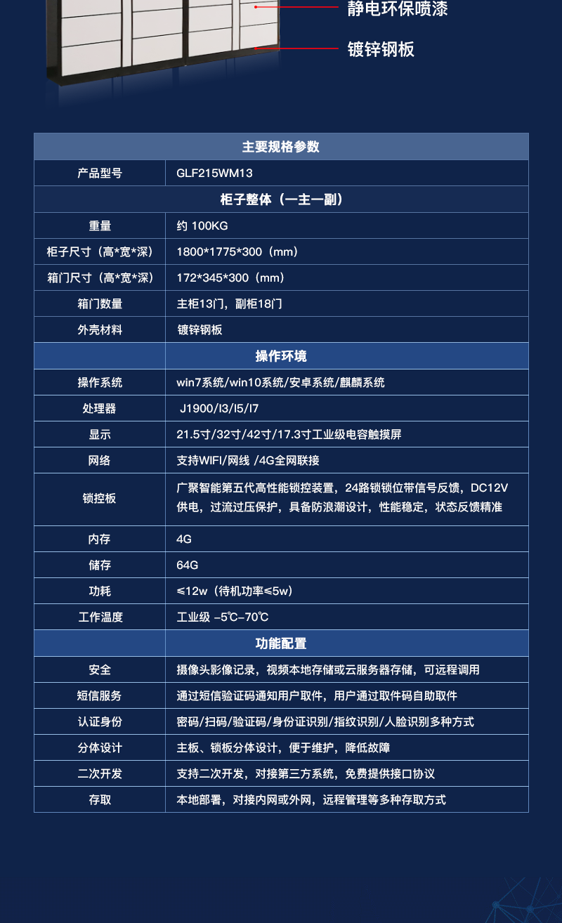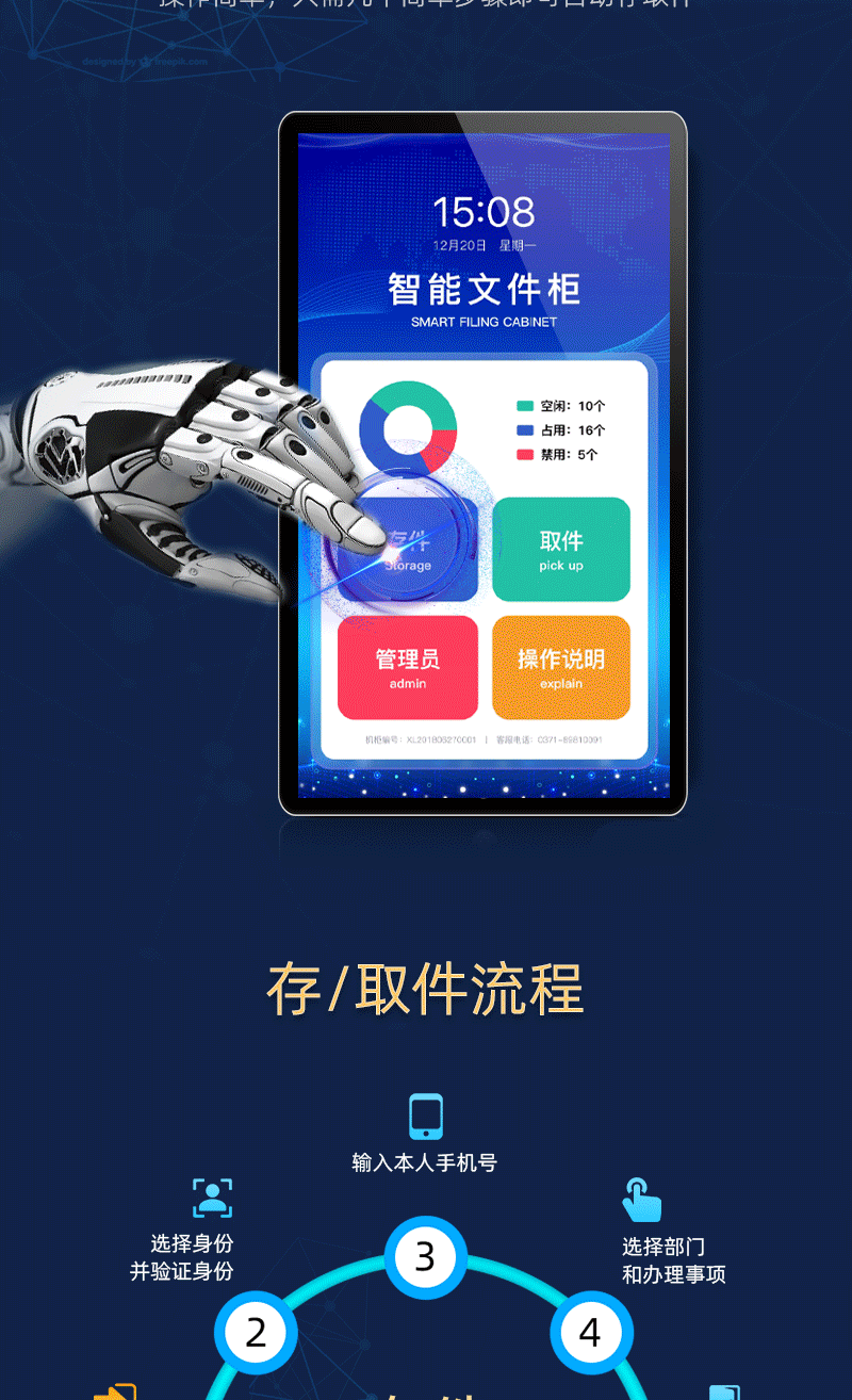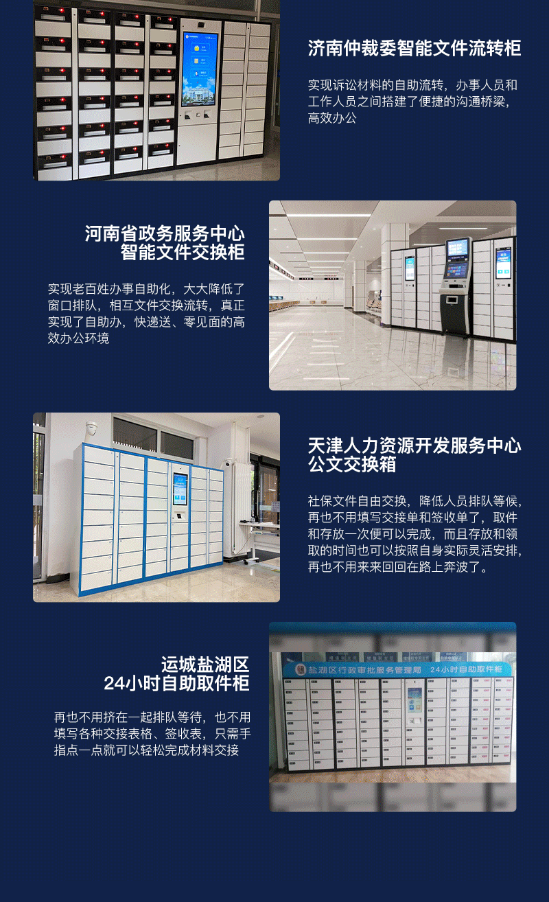 24小時自助存取件柜24小時自助存取件柜是一種放置于政務(wù)大廳、企業(yè)單位、法院、機關(guān)部門等地方,主要用于老百姓公文自助遞交、企業(yè)文件、公文、回執(zhí)之類的交換辦公使用,用戶將文件放置于柜子后提醒工作人員取走辦理,管理人員辦理完成后將文件重新放回柜子,柜子會